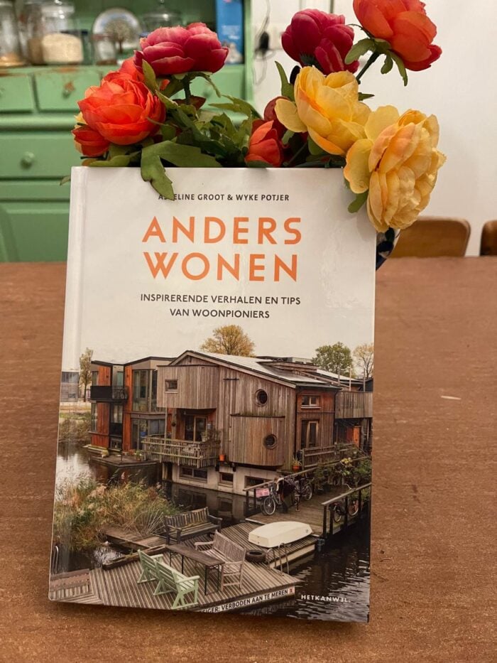 In het boek anders wonen vind je ‘inspirerende verhalen en tips van woonpioniers’. Op de voorkant van dit boek staat een houten huis dat lijkt te drijven op het water en wel wat weg heeft van een soort ark.