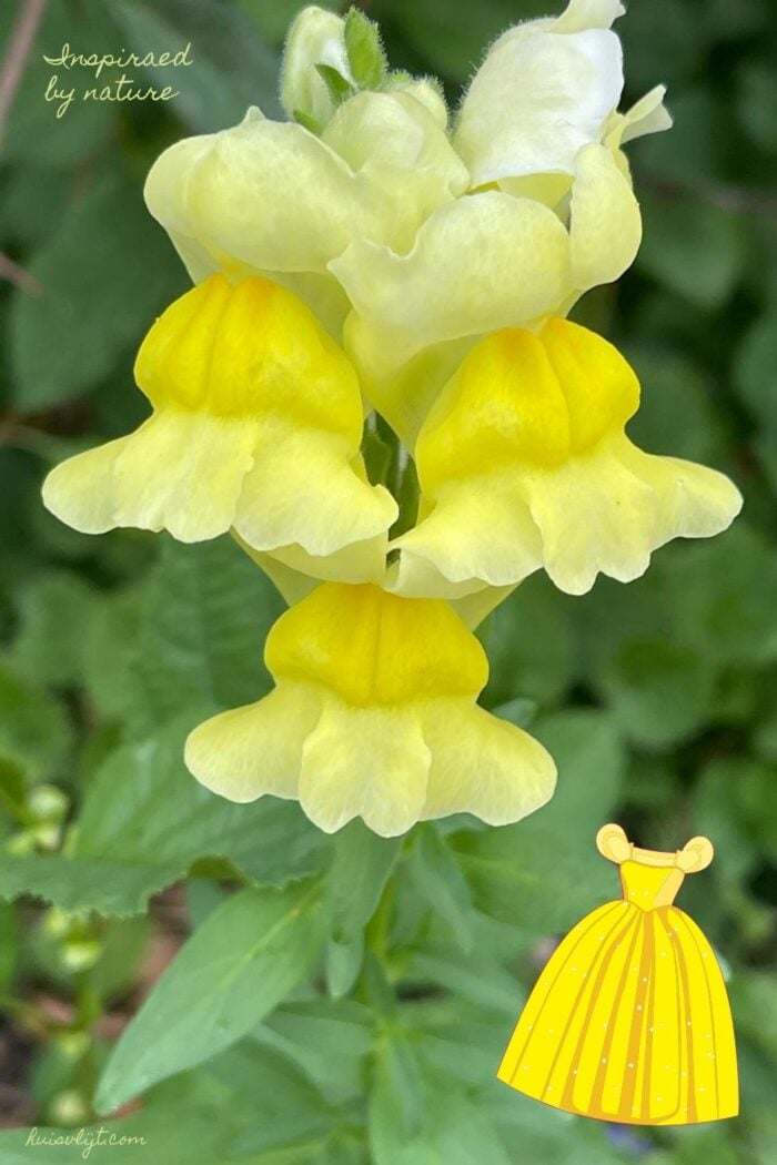 Toen ik na mijn meditatie het huis inliep, viel mijn oog op een charmant geel bloempje met weelderige vormen: een Antirrhinum. Het deed me ergens aan denken: de mooie gele jurk van Belle in de film Belle en het Beest!
