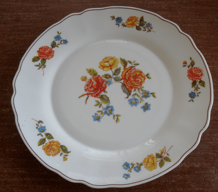 Ik eet het liefst van een mooi porseleinen bord met bloemetjes. Die gebruiken wij dan ook gewoon elke dag. Er sneuvelt er zelden een en ze blijven jaren mooi omdat ik ze met de hand afwas.