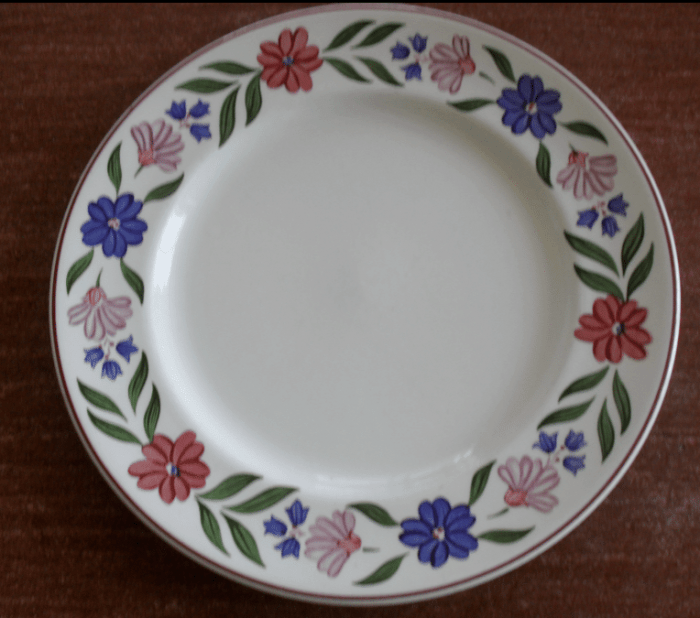 Onze borden hebben kleine bloemetjes op de rand. Ik heb ze al vanaf ons trouwen.