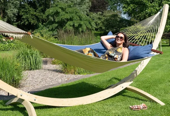 Ook als je geen bomen hebt kun je een hangmat ophangen. In dat geval kun je gebruik maken van een speciale hangmat standaard. Vaak kun je zelfs een hangmat inclusief standaard kopen. Hieronder zie je een voorbeeld van een mooie houten hangmat standaard: