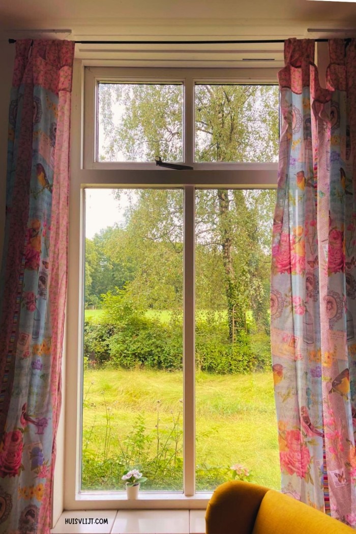 Mooi uitzicht en een vrolijk stukje gordijn erboven… niets aan veranderen (voorlopig dan hè, tot je in een ander stofje zin hebt, hahaha).