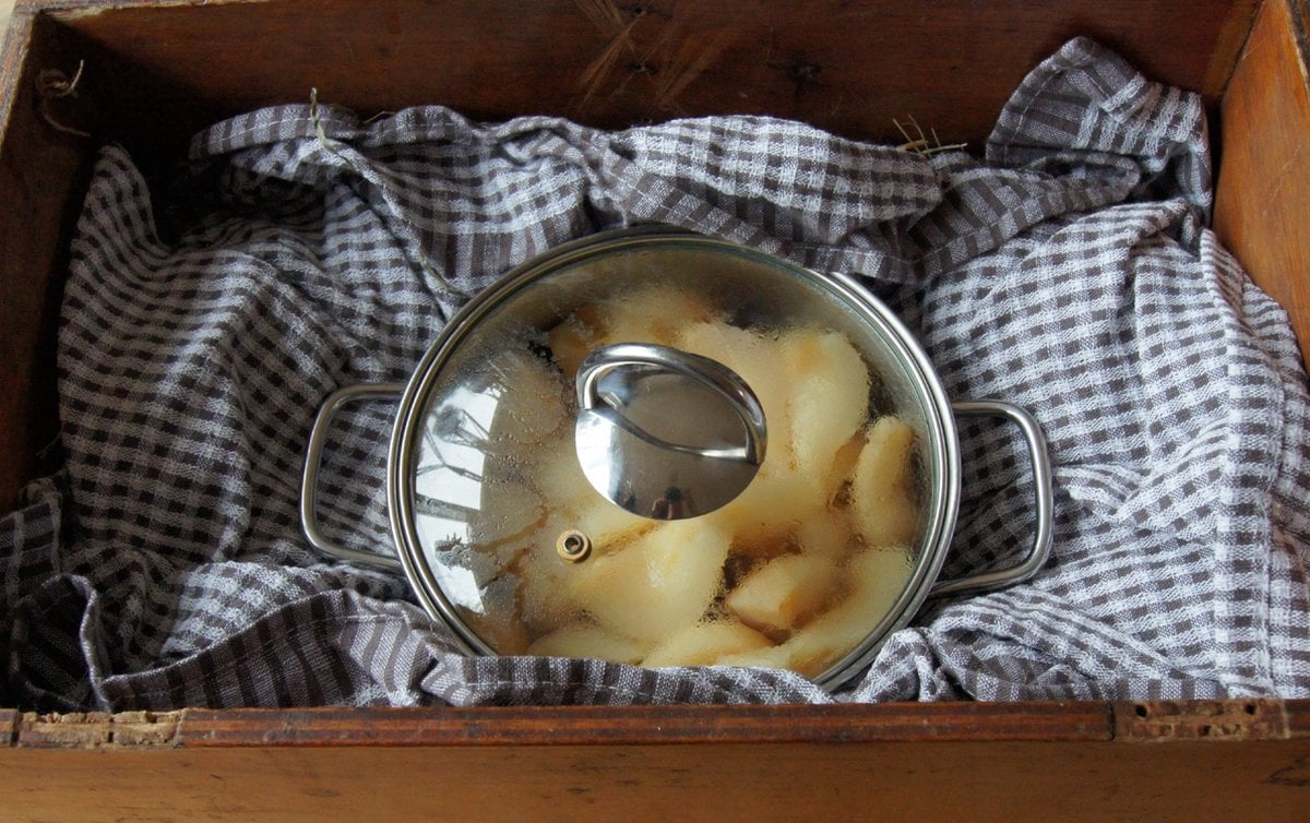 Bekleed de opbergdoos aan de binnenkant met de deken/stof en de kranten. Zet de pan erin, en doe de deksel erop zodat het daarbinnen lekker warm blijft.