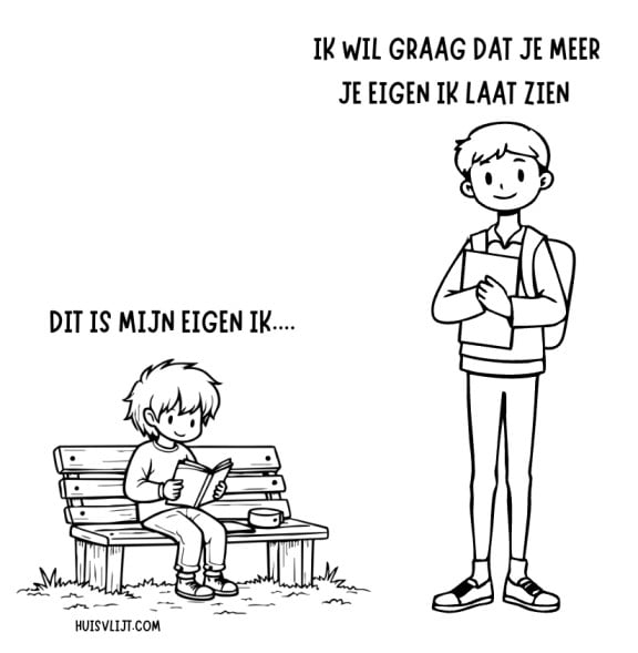 Hoezo, moeten ze meer van ‘hun eigen ik’ laten zien? Want wat als het eigen ik van deze kinderen simpelweg is dat ze introvert zijn? Dan zit je daar gewoon jezelf te zijn, en dan krijg je de impliciete boodschap dat je extraverter moet zijn. Nou dat weer! En je zit daar toch al niet voor niets natuurlijk.