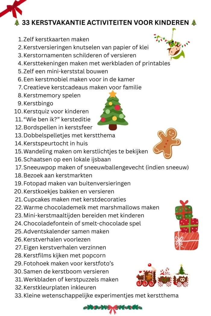 Hieronder een lijst met 27 praktische tips voor kerstvakantie activiteiten met kinderen: