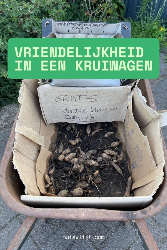Moet je kijken wat ik tot mijn verrukking op mijn maandagochtend hardlooprondje tegenkwam! Een grote kruiwagen gevuld met gratis Dahlia bloembollen! Een prachtig voorbeeld van de zogenoemde Kindness of strangers.