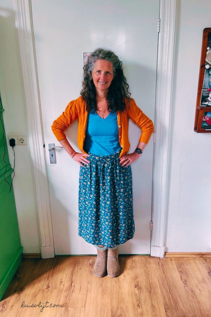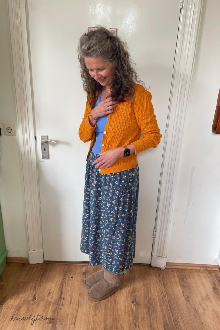Het oranje vestje is een miskoop van mijn jongste dochter: het was haar te groot! Dus nu is het van mij : ) Het blauwe t-shirt kocht ik ooit bij C&A.