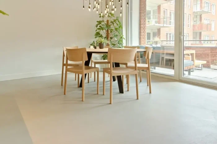 Hou je van een betonlook? Dan is Beton Cire een mooie optie. Vraag naar onderhoudsolie of lak die past bij jouw product en gebruik die regelmatig. Knip huisdiernagels, gebruik deurmatten binnen en buiten en check viltdoppen elk kwartaal. Hieronder een voorbeeld van een beton cire vloer:
