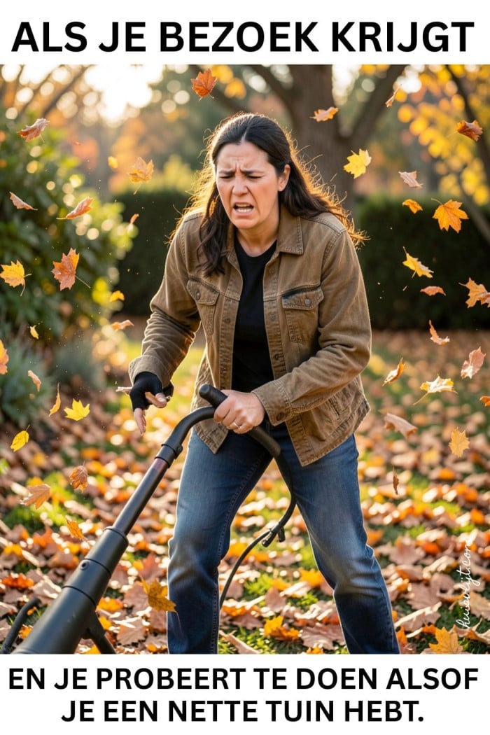 Dankjewel Ninon. Ik moest wel een beetje lachen om het beeld van de moeder die snel even alle blad wegblaast voordat haar kinderen naar school kunnen fietsen, voordat er bezoek komt. Dat deed me een beetje denken aan de ‘sneeuwploeg-moeder’. Overigens blijken bladblazers veel gevoelens op te roepen bij mensen, en dat leidt tot diverse memes en bladblazer humor. Zoals deze: