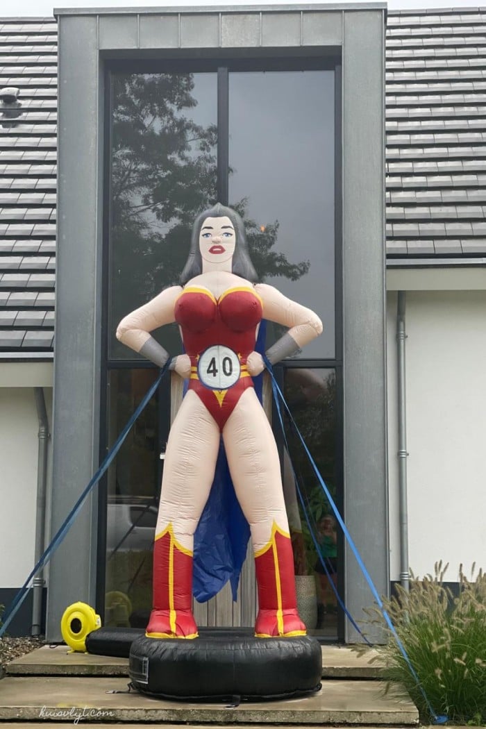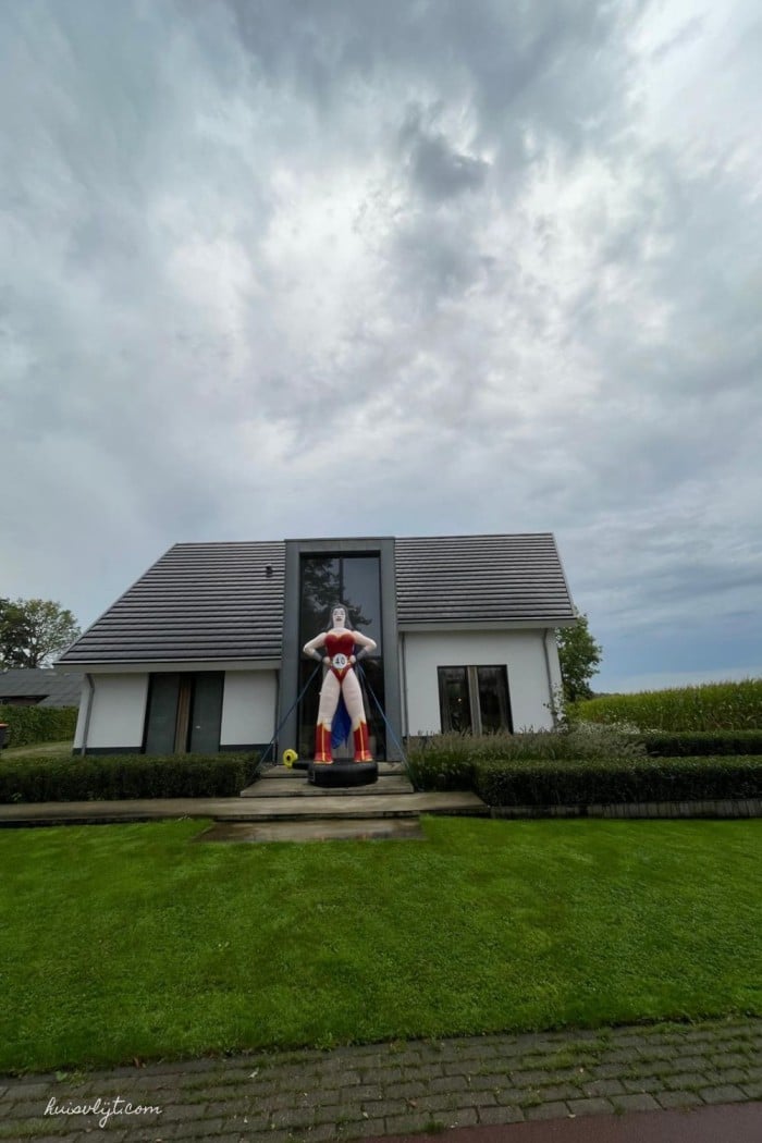 Deze monstruositeit stond pontificaal voor de voordeur van een modern, strak huis. De enigszins onheilspellende wolkenlucht een grimmig contrast met de jolige plastic superwoman.