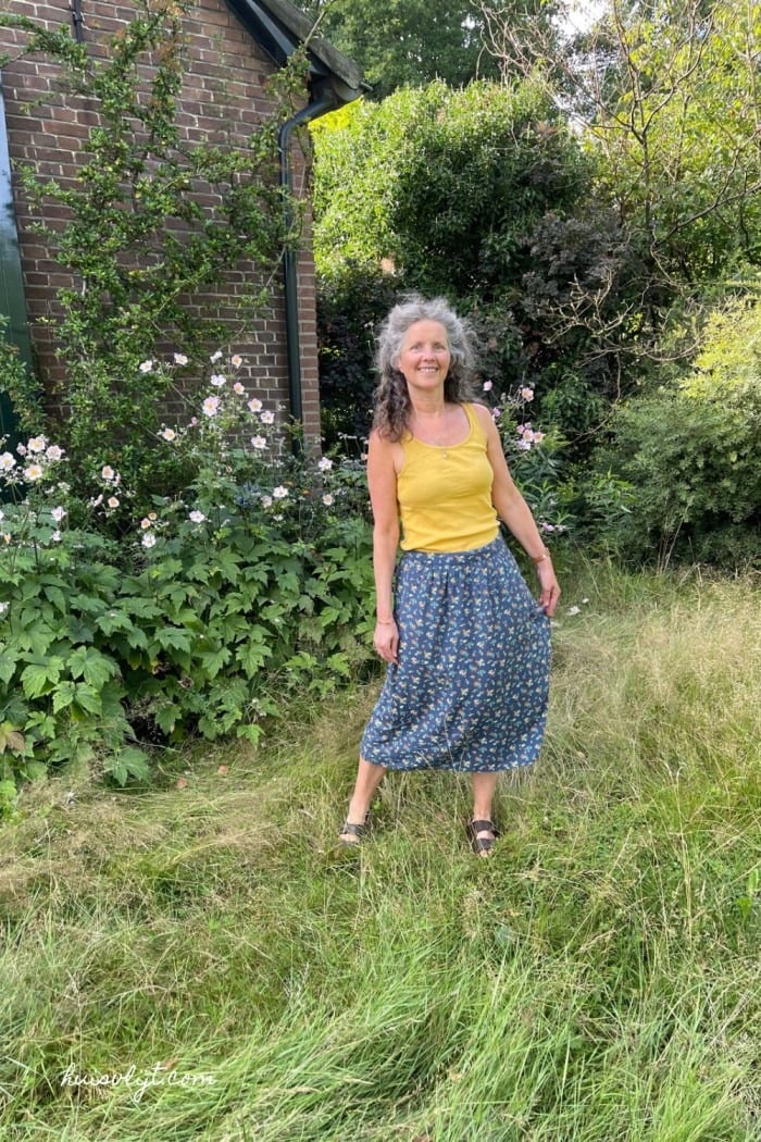 Ik draag altijd viscose broeken in de zomer. Ook gewoon netter broeken. Bij jou staat heel leuk. Blauwe rok met kleine bloemetjes is heel leuk!