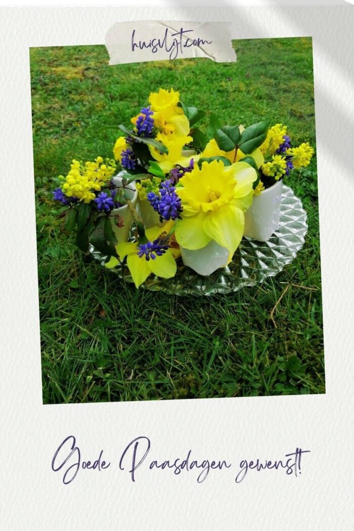Ik wens jullie hele goede Paasdagen met dit mooie paas bloemstuk! Mijn moeder maakte dit bloementafereel! Met bloemen uit eigen tuin.