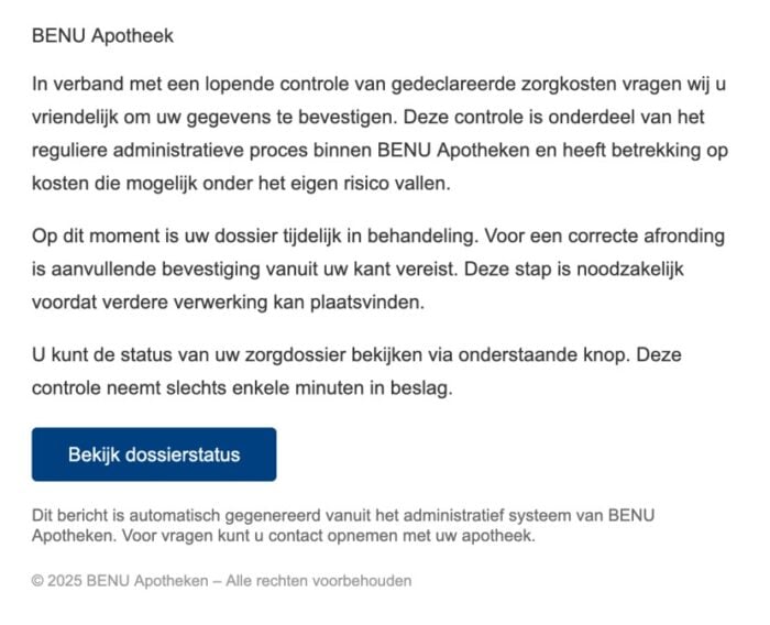 In verband met een lopende controle van gedeclareerde zorgkosten vragen wij u vriendelijk om uw gegevens te bevestigen. Deze controle is onderdeel van het reguliere administratieve proces binnen BENU Apotheken en heeft betrekking op kosten die mogelijk onder het eigen risico vallen.