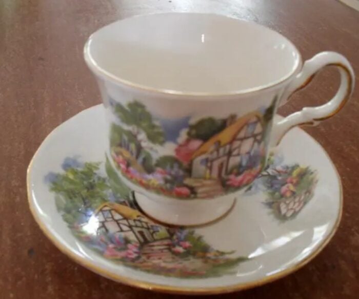 Tot afgelopen dinsdag toen ik met mijn dochter Teuntje naar een kringloopwinkel in Winterswijk ging. Daar stonden tot mijn blije verrassing zelfs twee kopjes en schotels met een cottage erop, met plakband aan elkaar geplakt. De hele set kostte 4 euro.