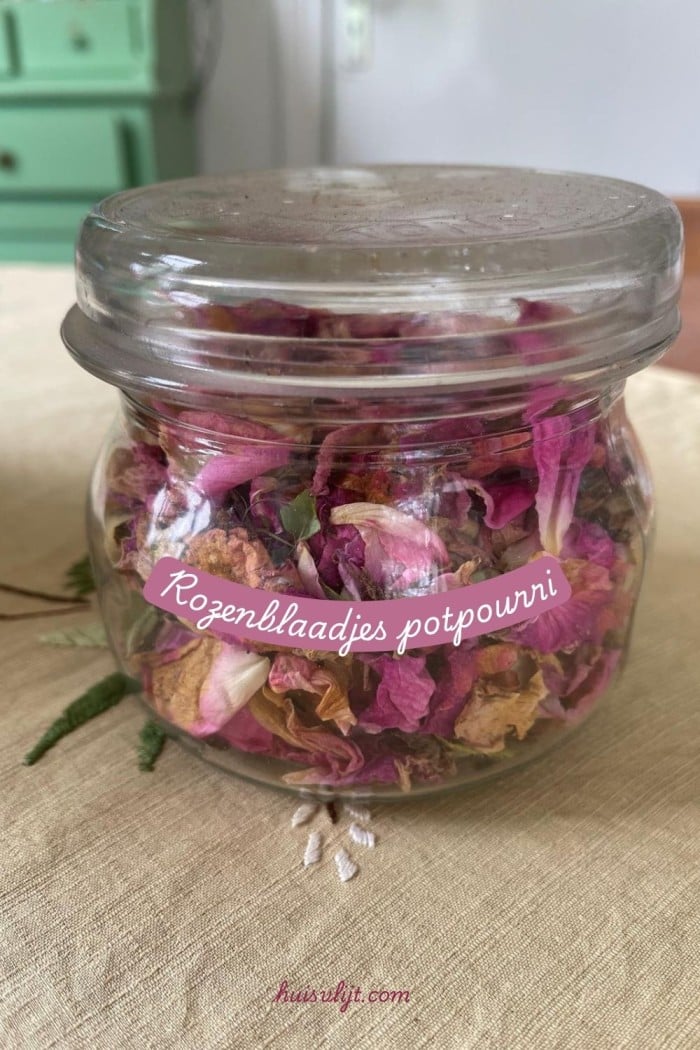Gedroogde rozenblaadjes als potpourri in een weckpot