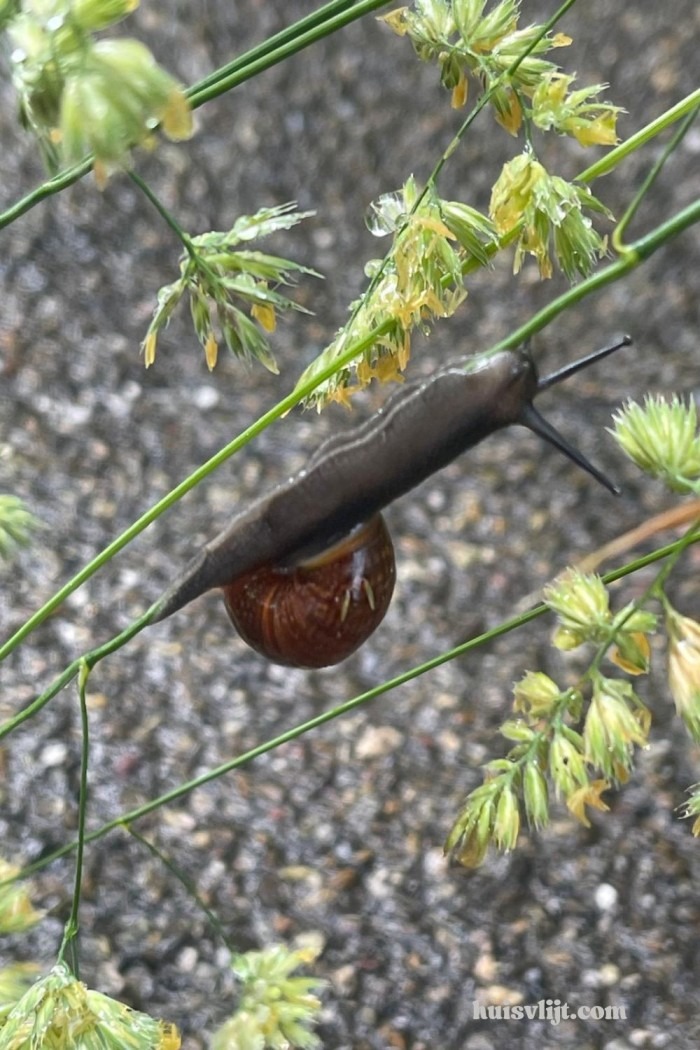 Ik was halverwege mijn vrijdagochtend hardlooprondje toen ik ineens een slak onderaan een plantenstengel zag bungelen. Normaliter zou ik daar ongeïnteresseerd aan voorbij stuiteren, maar door het natuurblog van Tine de Jong – waarin ze laat zien hoe insecten vaak onterecht als ‘saai’ worden gezien – kijk ik nu met andere ogen. En de positie waarin de slak zich bevond intrigeerde mij. Dus onderbrak ik mijn rondje, en zette het op een fotograferen!