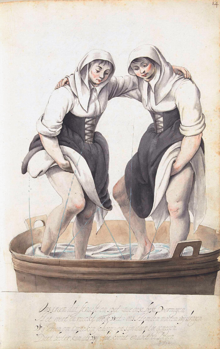 De was werd toen maar eens in de drie tot zes maanden gedaan, en mensen brachten hun vuile was naar de wasserij. Daar werd het zware werk verricht met grote houten stampers, aangedreven door een paard. Kleding werd gewassen met zeep gemaakt van botten en vet, omdat gewone zeep nog niet bestond.