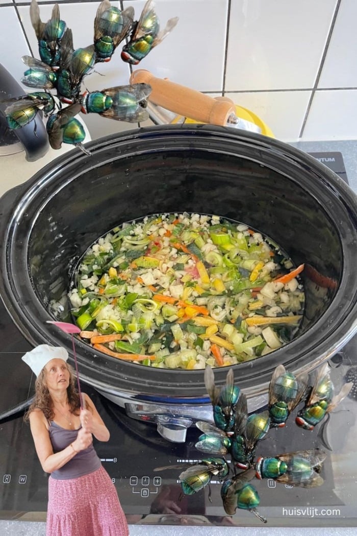 Het idee dat die blauwige vliegen op de soep afkwamen vind ik geen aanbeveling voor deze slowcooker groentesoep…