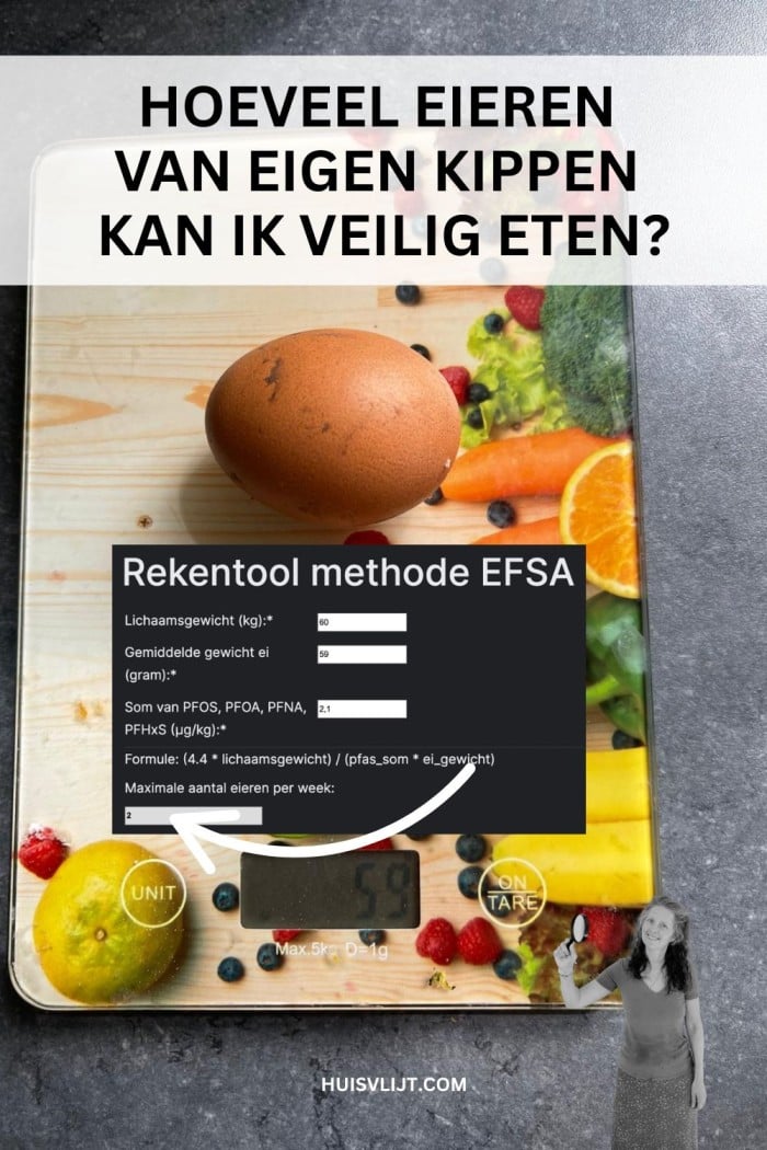Nou blijkt er warempel twee gratis online rekentools te zijn waarmee je kunt berekenen hoeveel eieren van eigen kippen je veilig kunt eten! Je moet dan wel de som van PFOS, PFOA, PFNA, PFHxS weten en het gewicht van je kippenei.