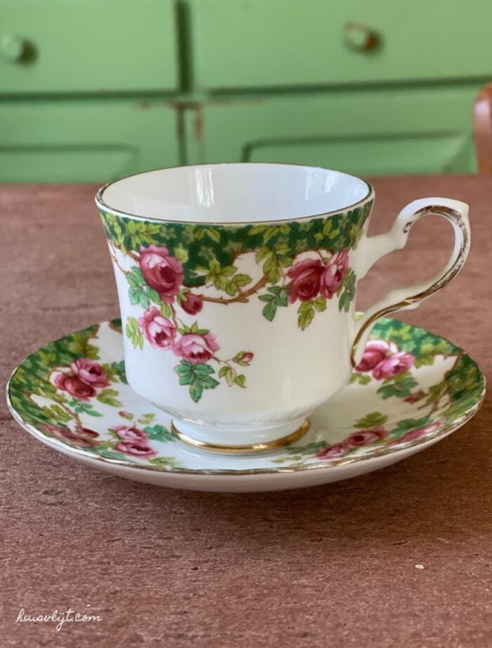 Op de onderkant van het schoteltje staat te lezen: ‘Olde English Garden, Royal Stafford, Bone China, Made in England est 1848.’ Als ik dat google zie ik dat op Etsy iemand dit vintage servies aanbiedt voor naar een schandelijke €39,95.