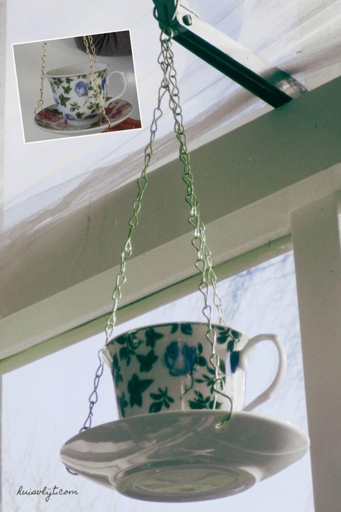 En moet je kijken wat een leuk kopje ik daar vond! Het is een kopje met schotel aan een ketting, waar vogelvoer in kan. Aanvankelijk wilde ik het dan ook buiten ophangen. Maar eenmaal thuis vond ik het zo leuk, dat ik het in de keuken heb opgehangen. De vogels moeten zichzelf maar redden. Het is toch helemaal niet koud buiten.