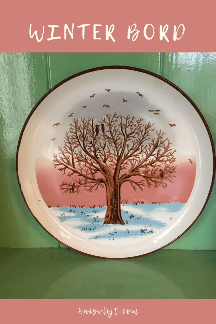 Ik houd ervan te leven met de seizoenen. Ook binnenshuis. Vandaar dat ik zo dol ben op mijn winter, lente, zomer en herfstkopje. In onze kelder kwam ik vier borden tegen met op elk bord een boom per seizoen. Ik heb het stof eraf geblazen en het winterbord een mooi plekje gegegeven in mijn servieskast. Het staat daar prachtig in mijn beeld als ik koffie drink ‘s ochtends. Ik kreeg het van mijn schoonmoeder en het is van Villeroy en Boch.